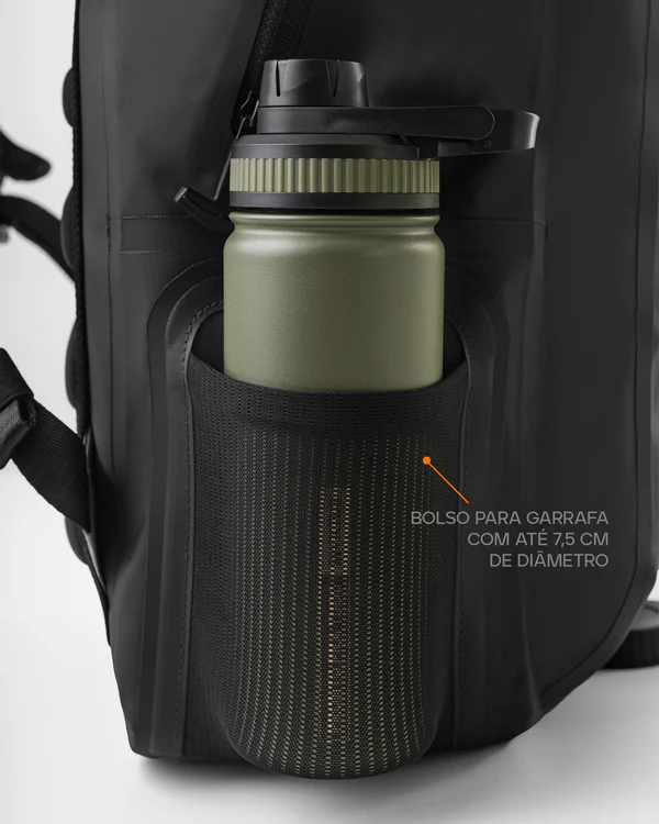 • Bolso lateral para garrafa, discreto, acomodando garrafas com até 7,5 cm de diâmetro.