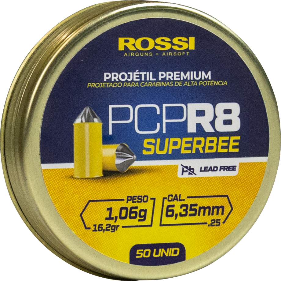 Projetil Premium Rossi PCP R8 calibre 6,35 mm, embalagem com 50 unidades. Desenvolvido especialmente para carabinas PCP de alta precisão, o projetil R8 oferece desempenho superior em agrupamento e impacto, resultado de molde e acabamento de alta qualidade. Ideal para treino, competição e situações que exigem consistência nos disparos.